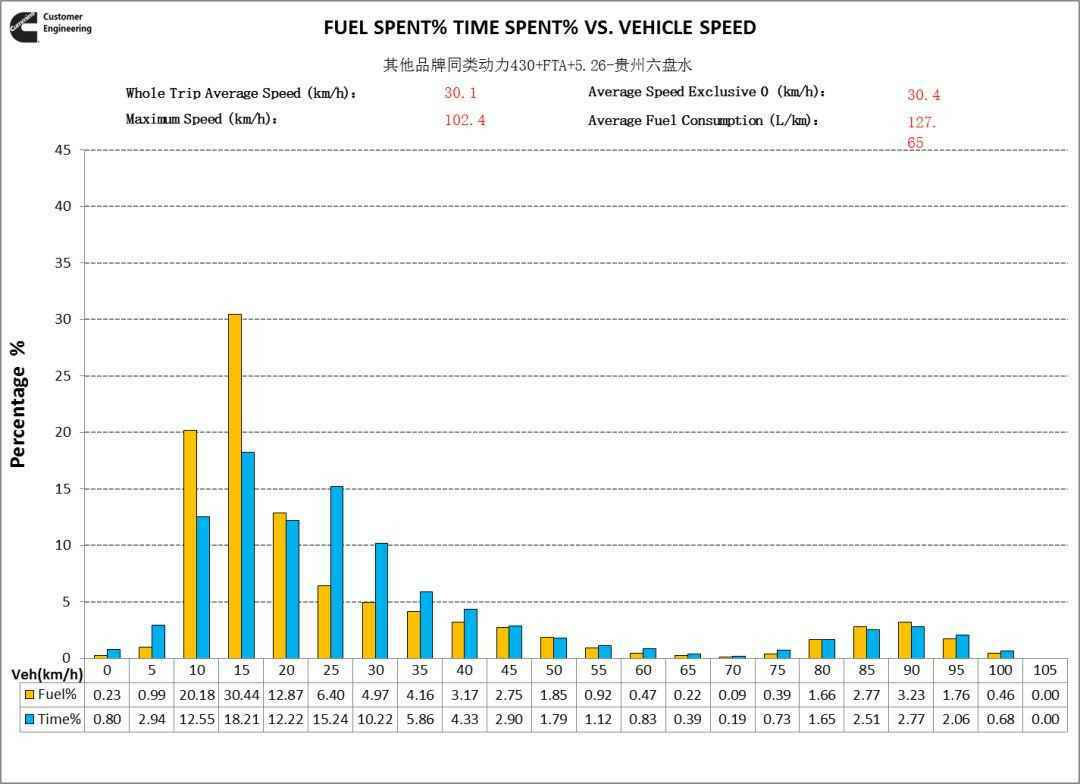 从爬坡工况转速分布看,福康X12动力转速重心在1500rpm,其他品牌动力转速重心在1600~1700rpm,福康X12动力使用转速更低。这就是福康低转速大扭矩的特性,可以让司机选择高一个挡位运行,降低了发动机转速,当然好处就是不仅满足动力性需求,还节油。
