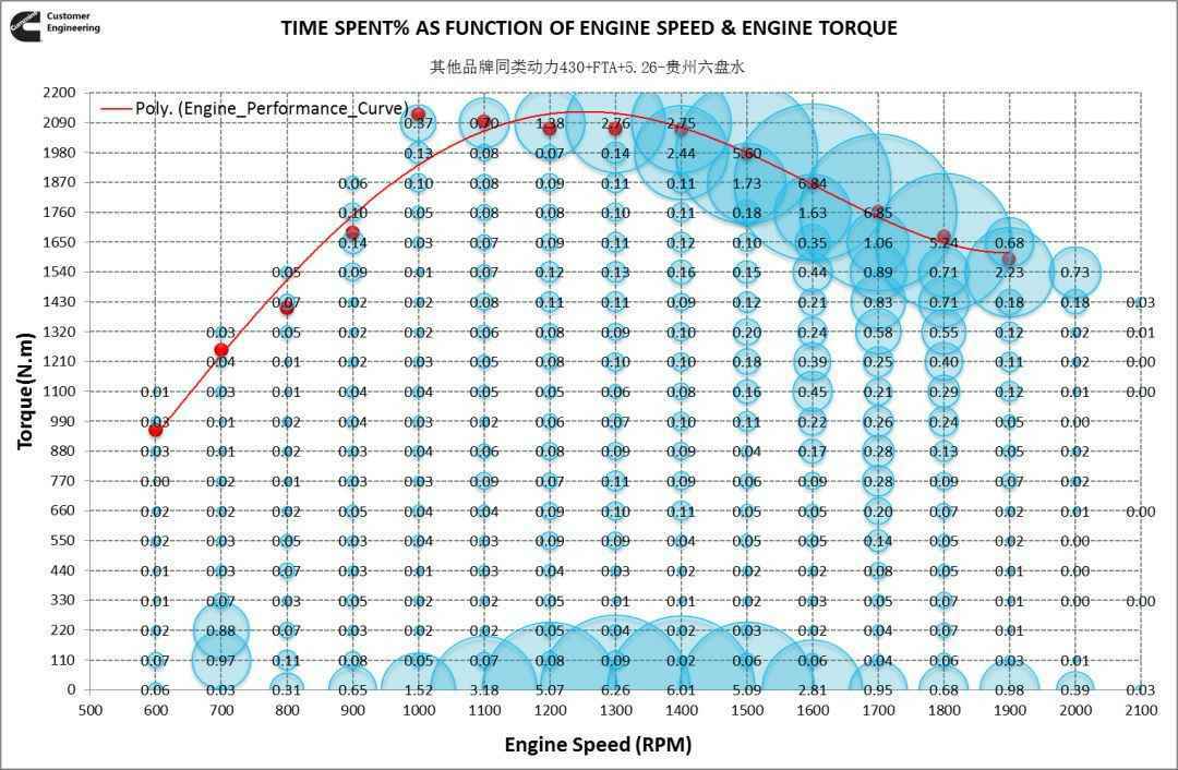 从Duty cycle分布看,车辆工况较恶劣,多运行在满负荷区域,相比之下福康X12发动机在外特性运行占比稍少,得益于X12-430发动机比其他品牌动力扭矩更大,具备更优的道路坡度适应性,动力性占优势。